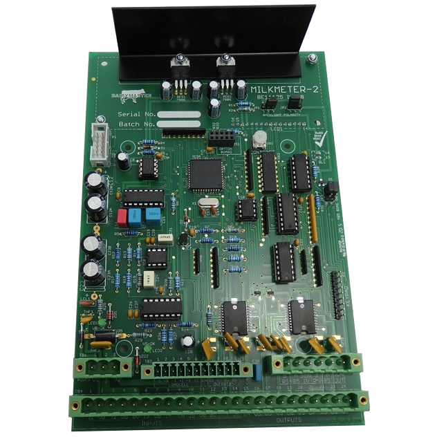 Плата контроллера молокомера Dairymaster с четырьмя разъёмами для подключения. С дисплеем. Без передней панели.