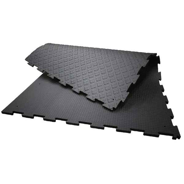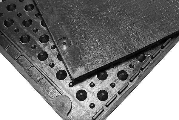В состав матов водят резиновый наполнитель, полимеры, вулканизирующая группа. Крепление к бетонному основанию осуществляется на дюбеля. Шипы с нижней стороны обеспечивают мягкость, упругость и эластичность. Уклон на покрытии в сторону прохода способствует ускорению высыхания поверхности.