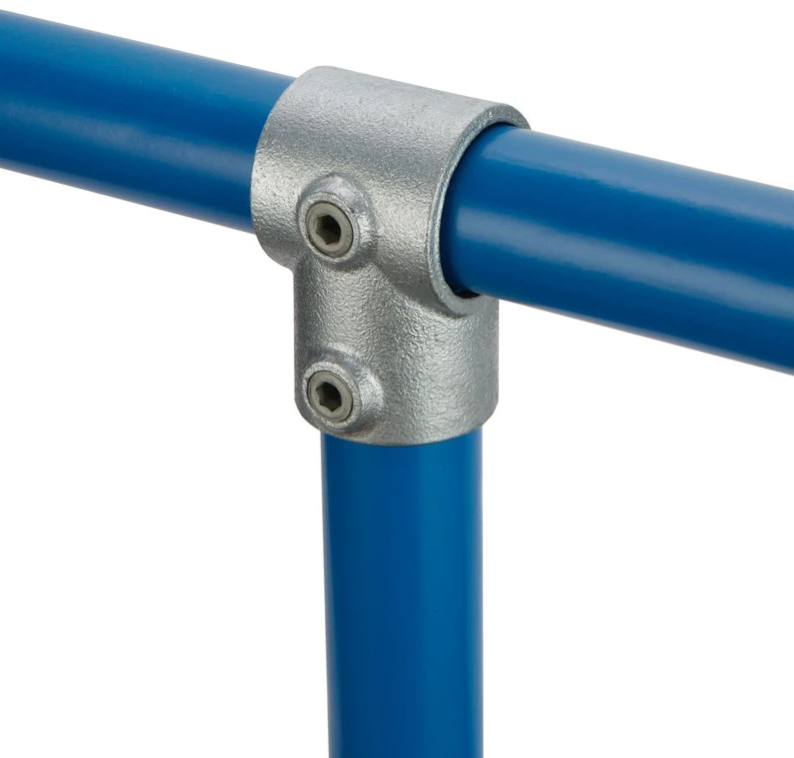 Т-образное крепление Kee Klamp часто используется для соединения стоек с трубой, например перила или ограждения. Это крепление также используется для крепления основания стеллажей.